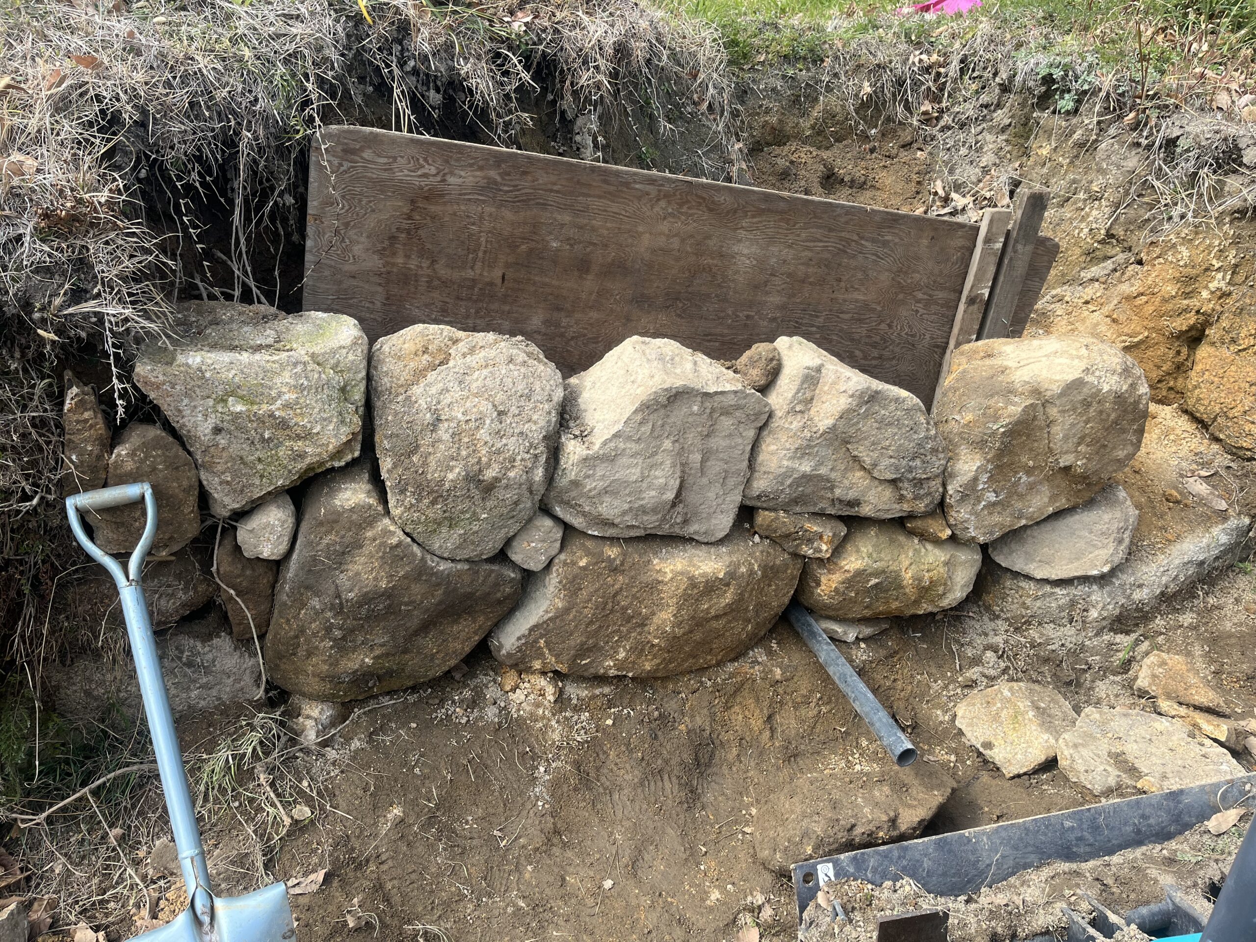 重機、クレーンを使って石を積んでいきます。湧水対策として排水設備